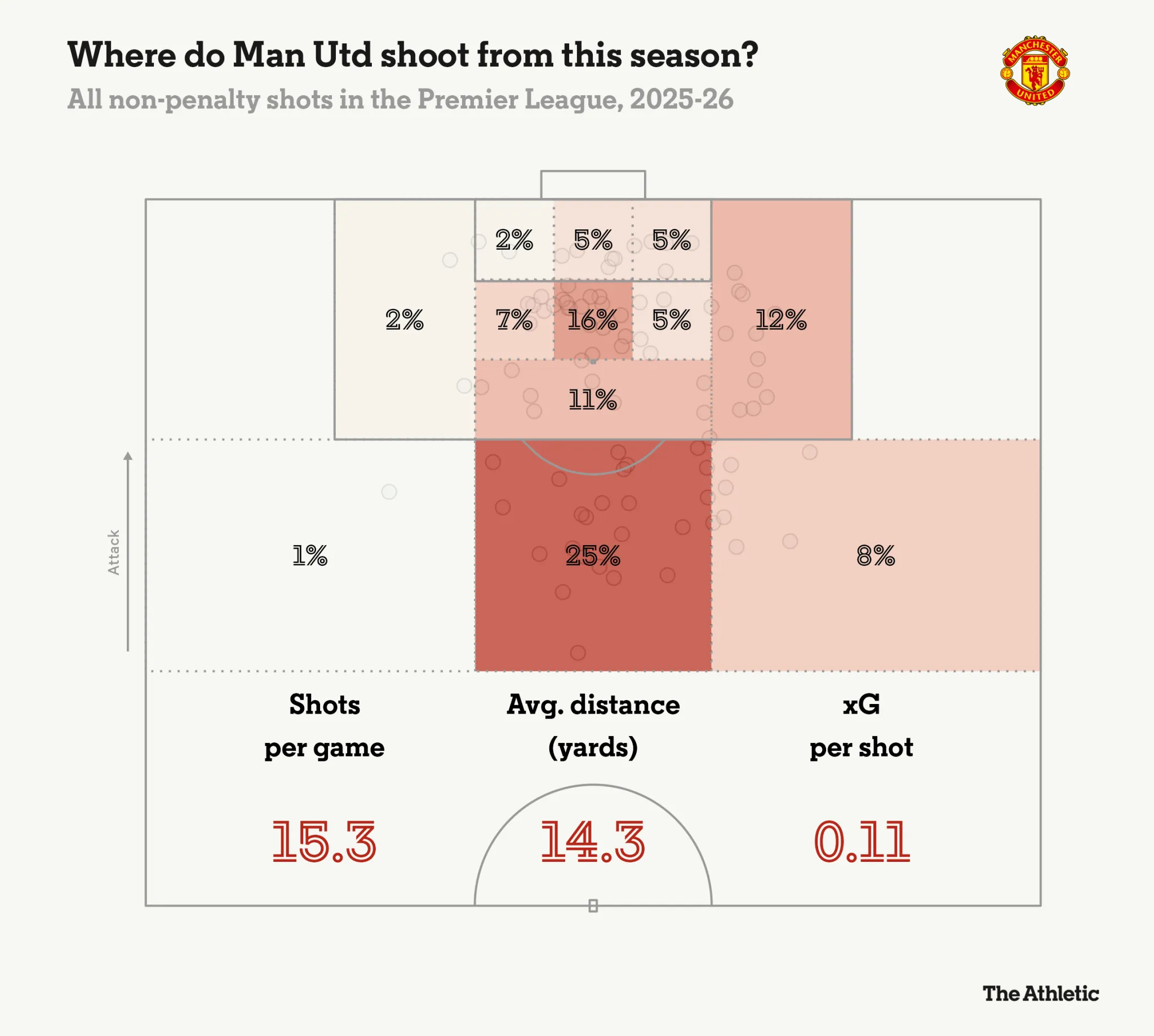 2025-26賽季至今,曼聯(lián)場(chǎng)均預(yù)期進(jìn)球數(shù)(xG)為2.1個(gè)。他們創(chuàng)造了更多優(yōu)質(zhì)射門機(jī)會(huì),部分原因在于布萊恩-姆貝莫和馬特烏斯-庫(kù)尼亞的加盟,但射門次數(shù)(場(chǎng)均15.3次,聯(lián)賽最高)也是一個(gè)因素。