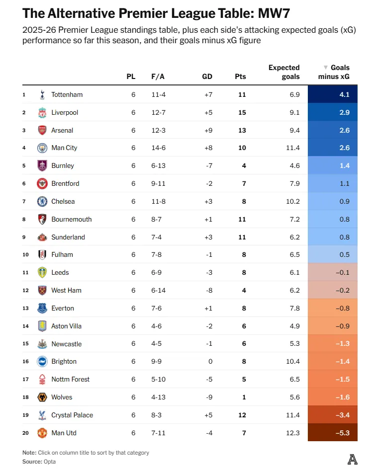 來(lái)源:紐約時(shí)報(bào)虎撲10月02日訊 The Athletic UK制作英超賽季至今的預(yù)期進(jìn)球數(shù)統(tǒng)計(jì)表,解析進(jìn)攻問題。
