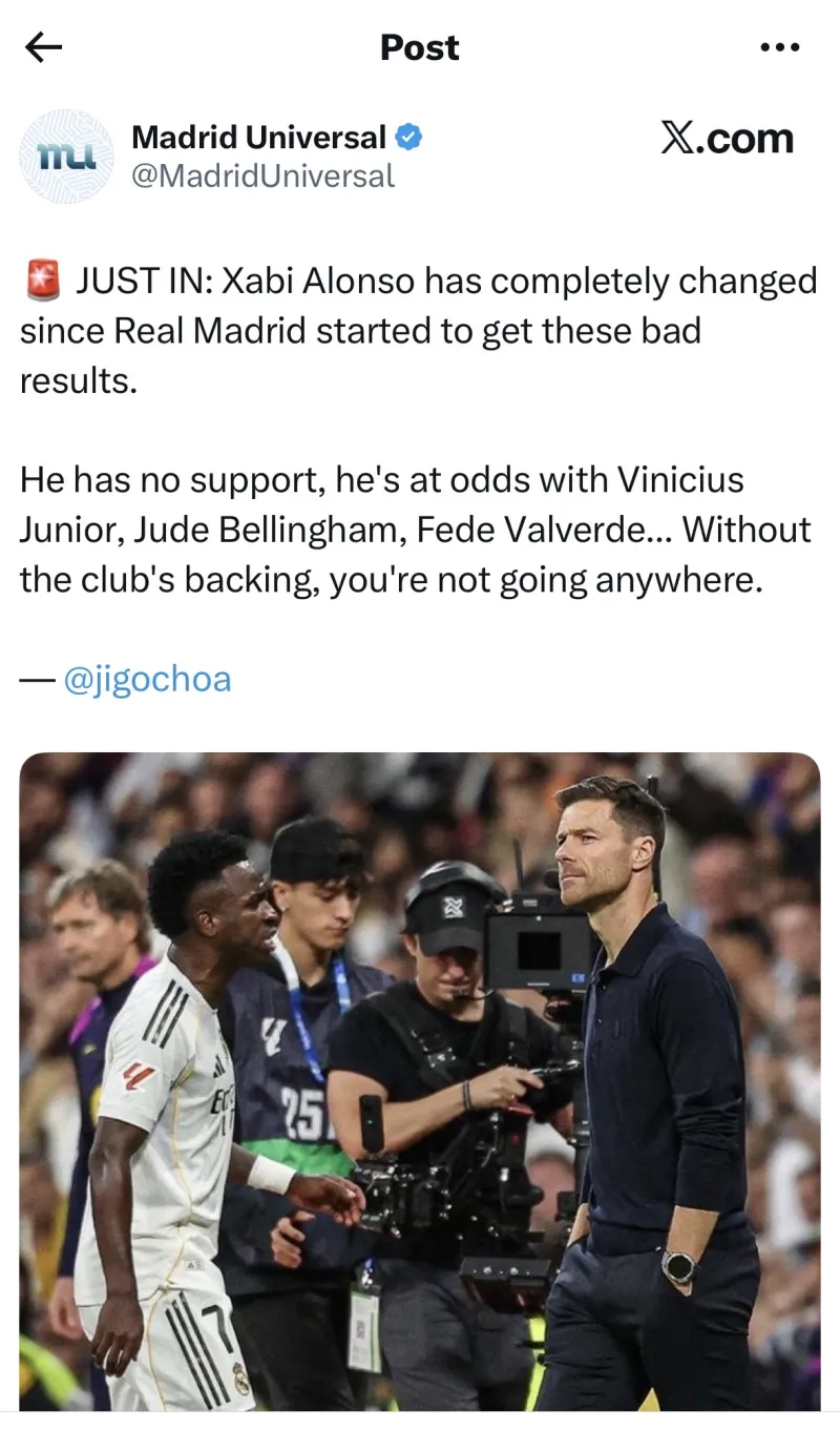 他沒有任何支持,阿隆和維尼修斯、索已失去貝林厄姆、貝林巴爾韋德等球員關(guān)系緊張……沒有俱樂部的 backing,他走不遠(yuǎn)。