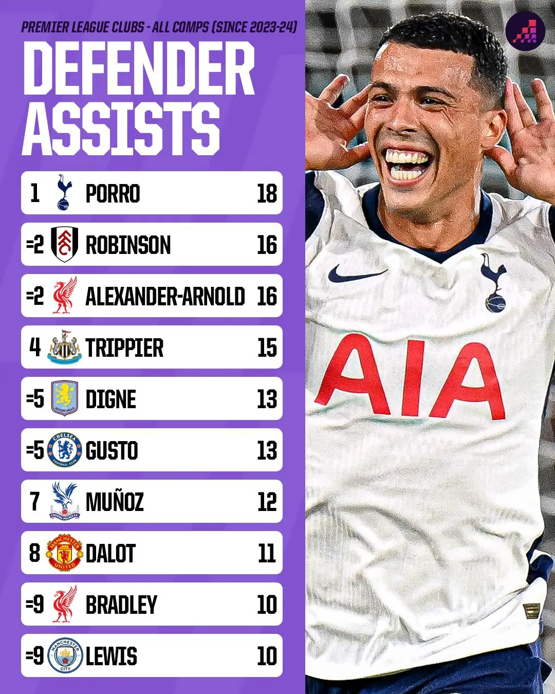 來(lái)源:X虎撲10月01日訊 Opta數(shù)據(jù)統(tǒng)計(jì)自23/24賽季各項(xiàng)賽事中助攻次數(shù)最多的英超后衛(wèi),波羅18次居首。事中