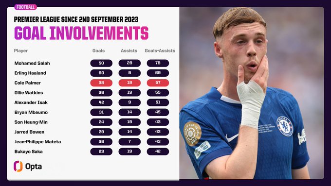 帕爾默:38進球,爾默19助攻,英超英超參與進球57粒