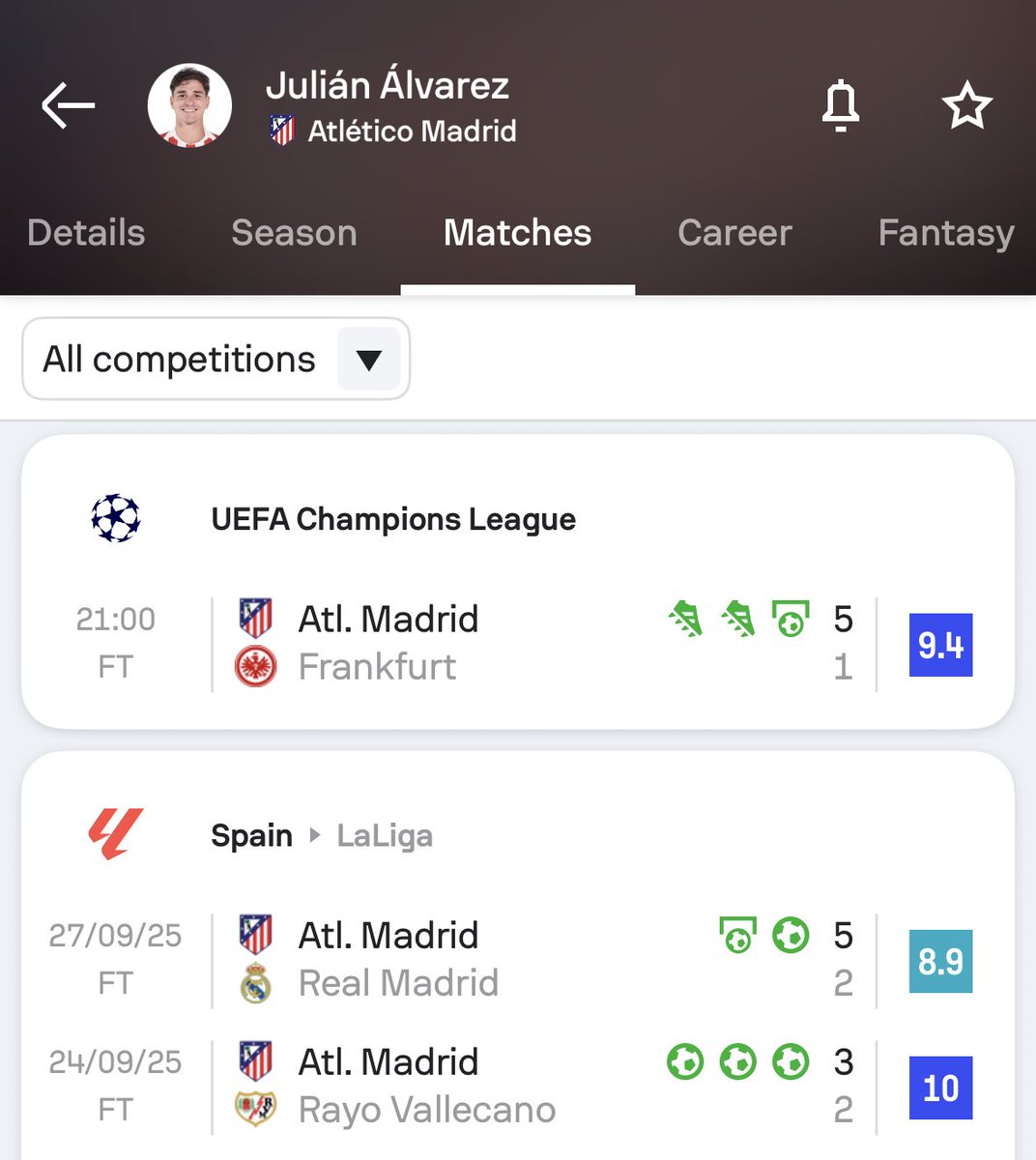 來(lái)源:X虎撲10月01日訊 根據(jù)Sofascore統(tǒng)計(jì),在過(guò)去七天里,板阿比賽阿爾瓦雷斯踢了三場(chǎng)比賽,爾瓦平均每33分鐘就能參與一粒進(jìn)球。近天
