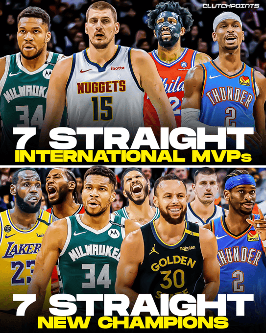 其寫道:七個賽季,MVP都由國際球員包攬。