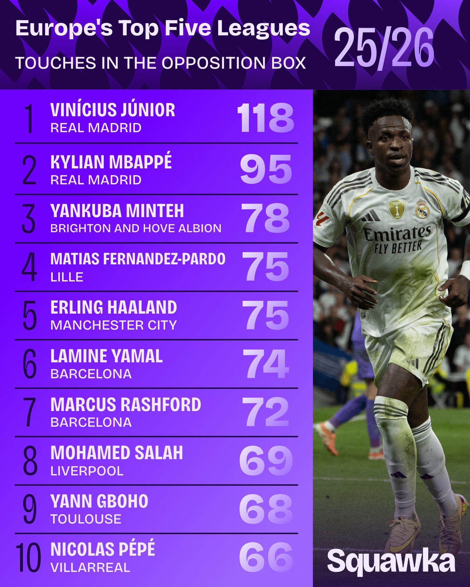 虎撲11月21日訊 Squawka數(shù)據(jù)統(tǒng)計(jì)本賽季至今五大聯(lián)賽球員對(duì)方禁區(qū)觸球榜,維尼修斯、姆巴名前姆巴佩排名前二。佩排