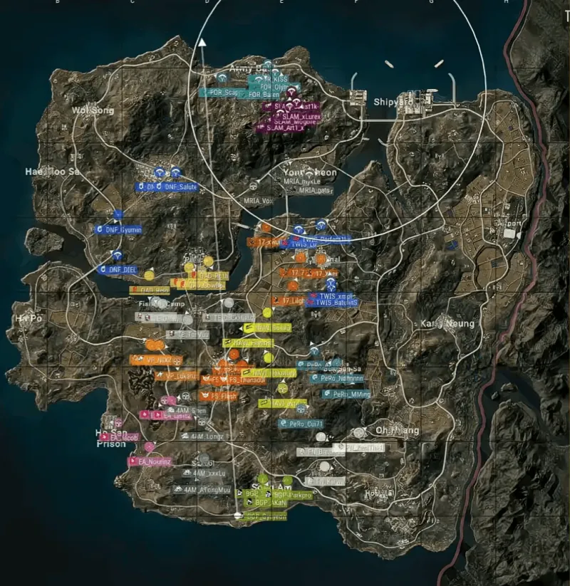 本局決賽圈位于地圖北部軍事基地南側(cè)山坡。