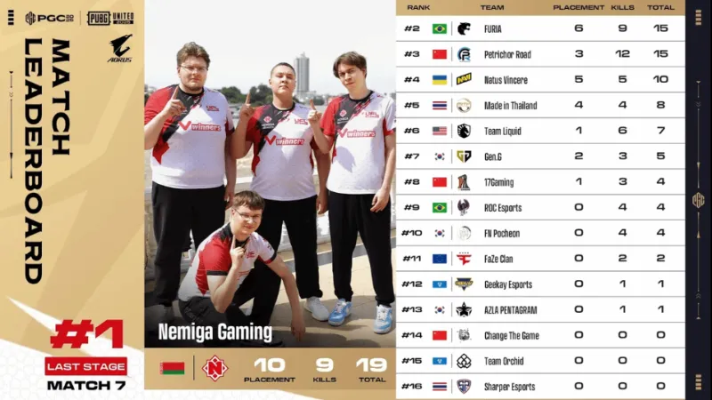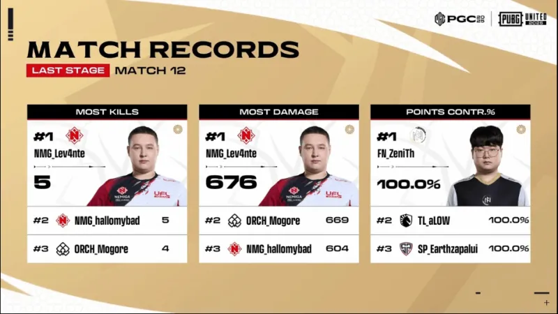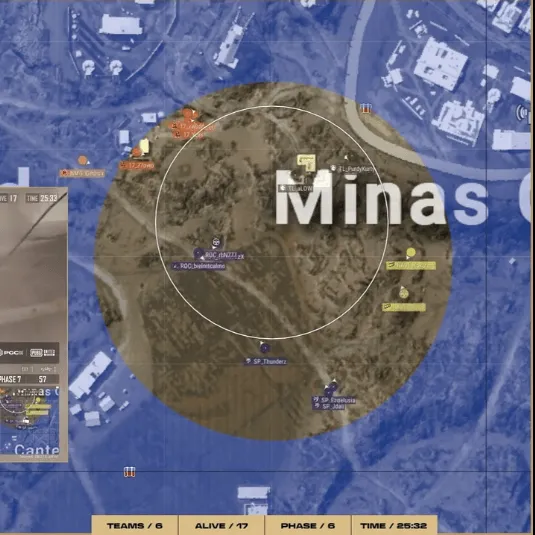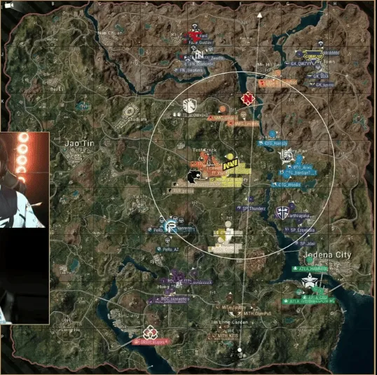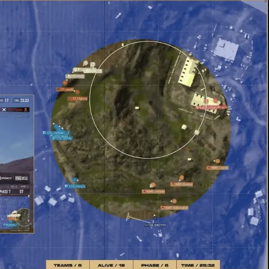 階段6,GEN與17發(fā)生交戰(zhàn),同時(shí)CTG也來勸架,17損失三人。另外一邊,NMG偷掉CTG掛后一人,隨后NMG乘勝追擊將CTG淘汰。階段7,NMG將17最后一人打掉,場(chǎng)上剩下四支隊(duì)伍。