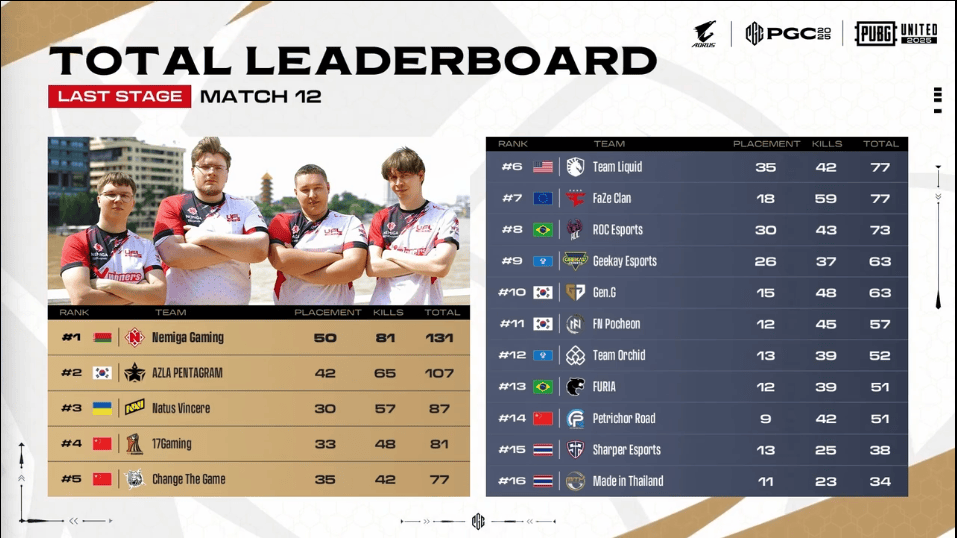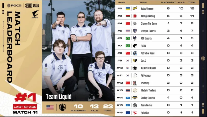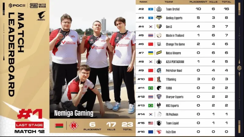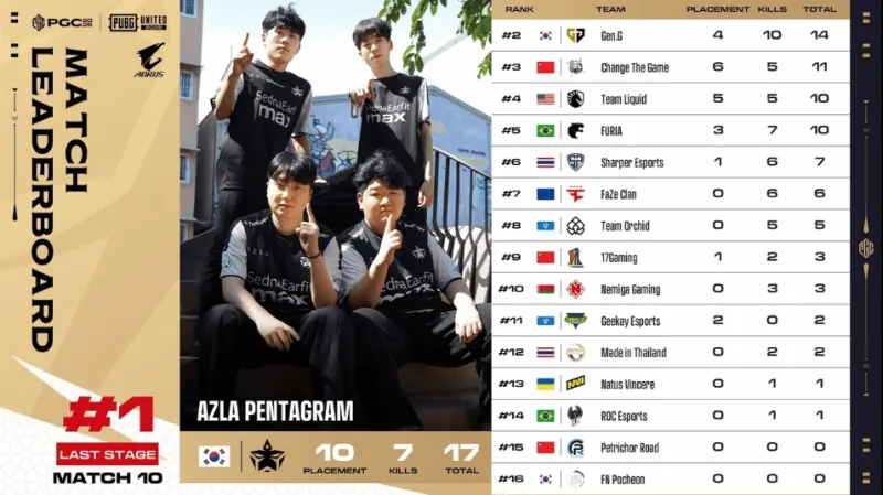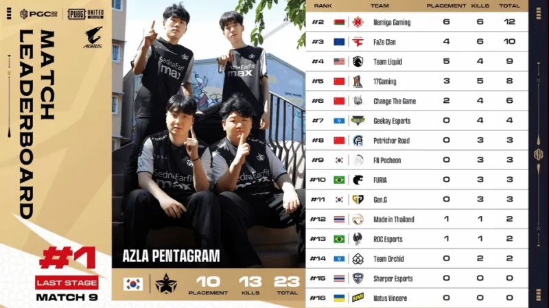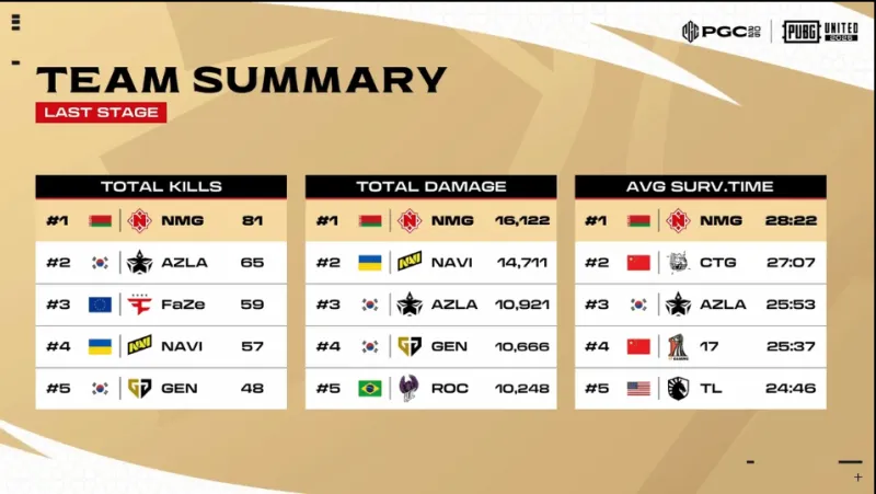 決賽圈,GEN獨(dú)狼被CTG淘汰出局,隨后AZLA與TL交戰(zhàn),CTG也加入戰(zhàn)斗,三隊(duì)混戰(zhàn)TL先被淘汰出局,最終AZLA一顆手雷再將高點(diǎn)的CTG淘汰,AZLA成功吃雞。