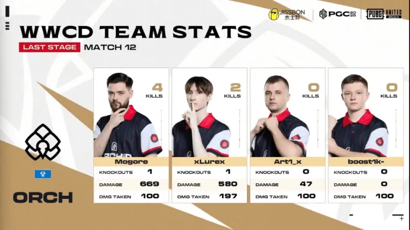 決賽圈,GEN被ORCH與NMG兩隊(duì)夾擊淘汰,GK獨(dú)狼也被發(fā)現(xiàn)并淘汰,場(chǎng)上剩余ORCH2打1NMG,ORCH利用槍線配合輕松淘汰NMG最后一人成功吃雞。