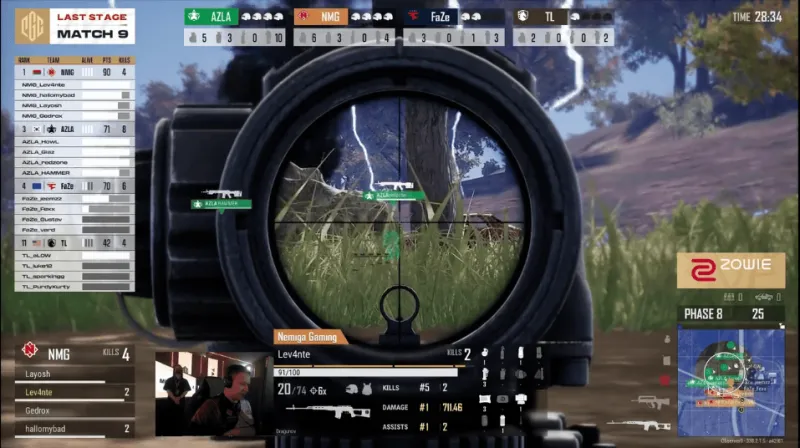 決賽圈,F(xiàn)AZE兩人被NMG和AZLA夾擊淘汰,TL獨(dú)狼也被發(fā)現(xiàn)并被淘汰。 最終AZLA與NMG4v4,AZLA依靠道具和槍線配合將NMG四人淘汰,AZLA成功吃雞。