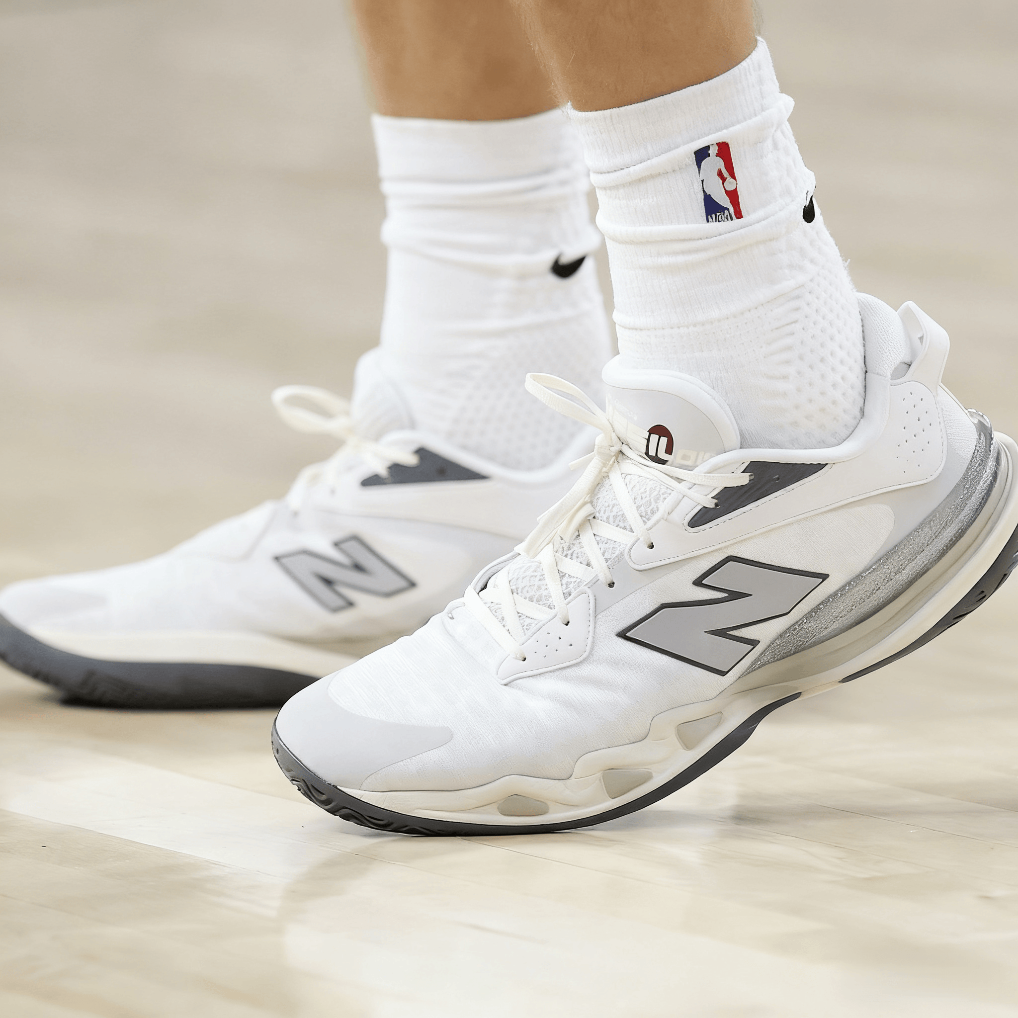比賽中,對(duì)陣獨(dú)行俠隊(duì)球員庫(kù)珀-弗拉格上腳New Balance Hesi Low V2。流言拉格