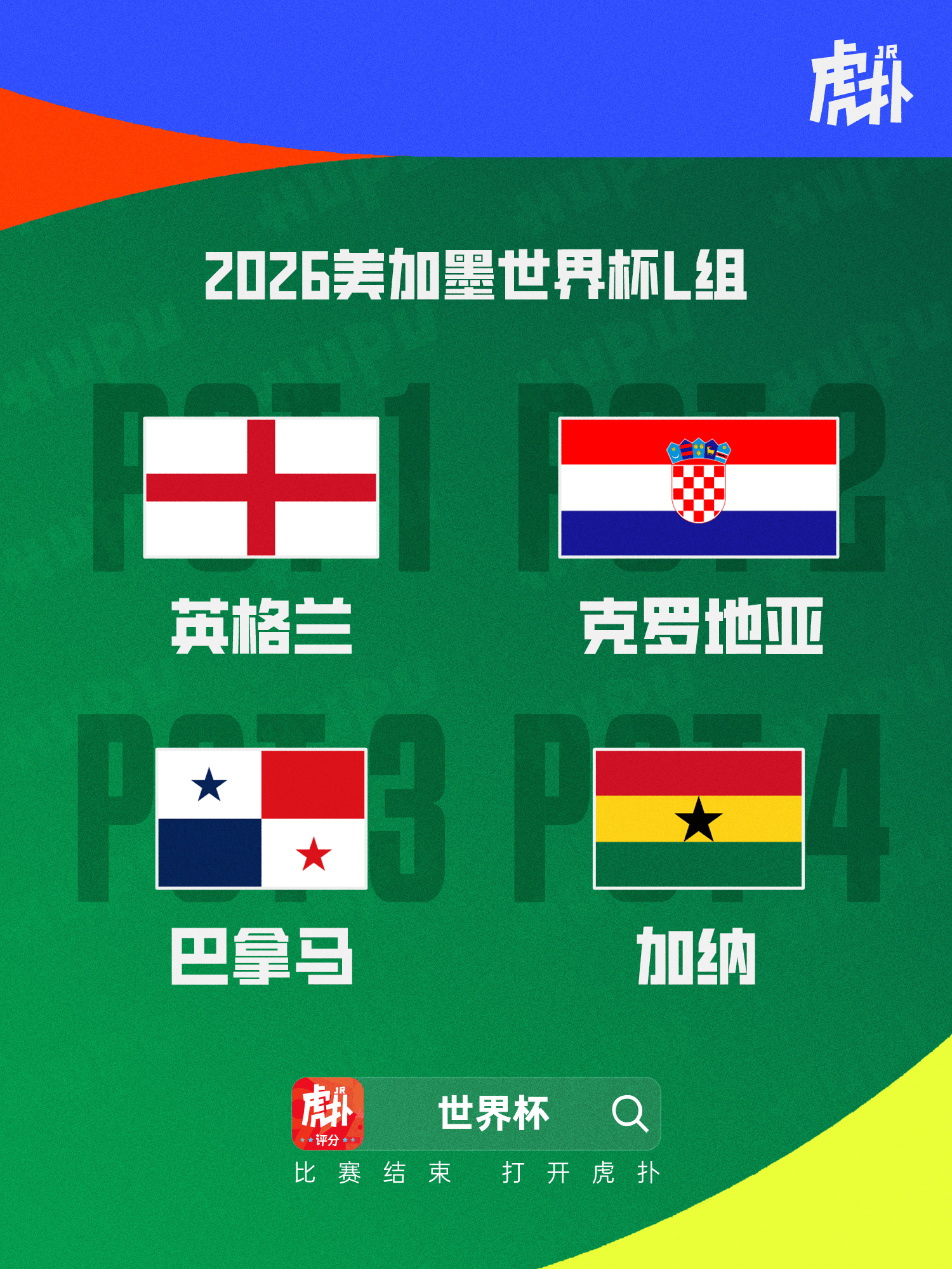 虎撲12月06日訊 2026美加墨世界杯分組抽簽儀式在華盛頓進(jìn)行。L組的英格亞巴4支球隊(duì)為英格蘭、克羅地亞、拿馬巴拿馬、流言蘭克羅地加納。板世