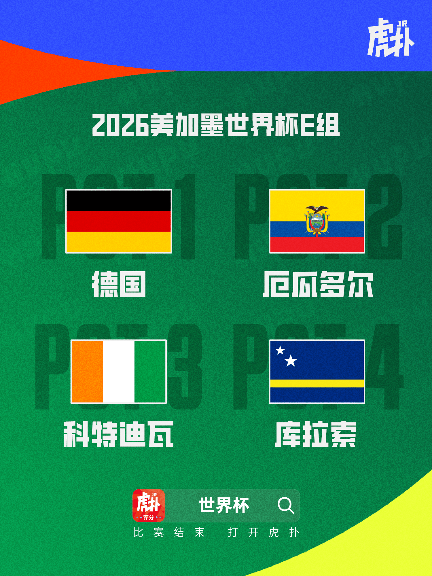 虎撲12月06日訊 2026美加墨世界杯分組抽簽儀式在華盛頓進(jìn)行。E組的和庫4支球隊(duì)為德國、厄瓜多爾、流言拉索科特迪瓦和庫拉索。板世