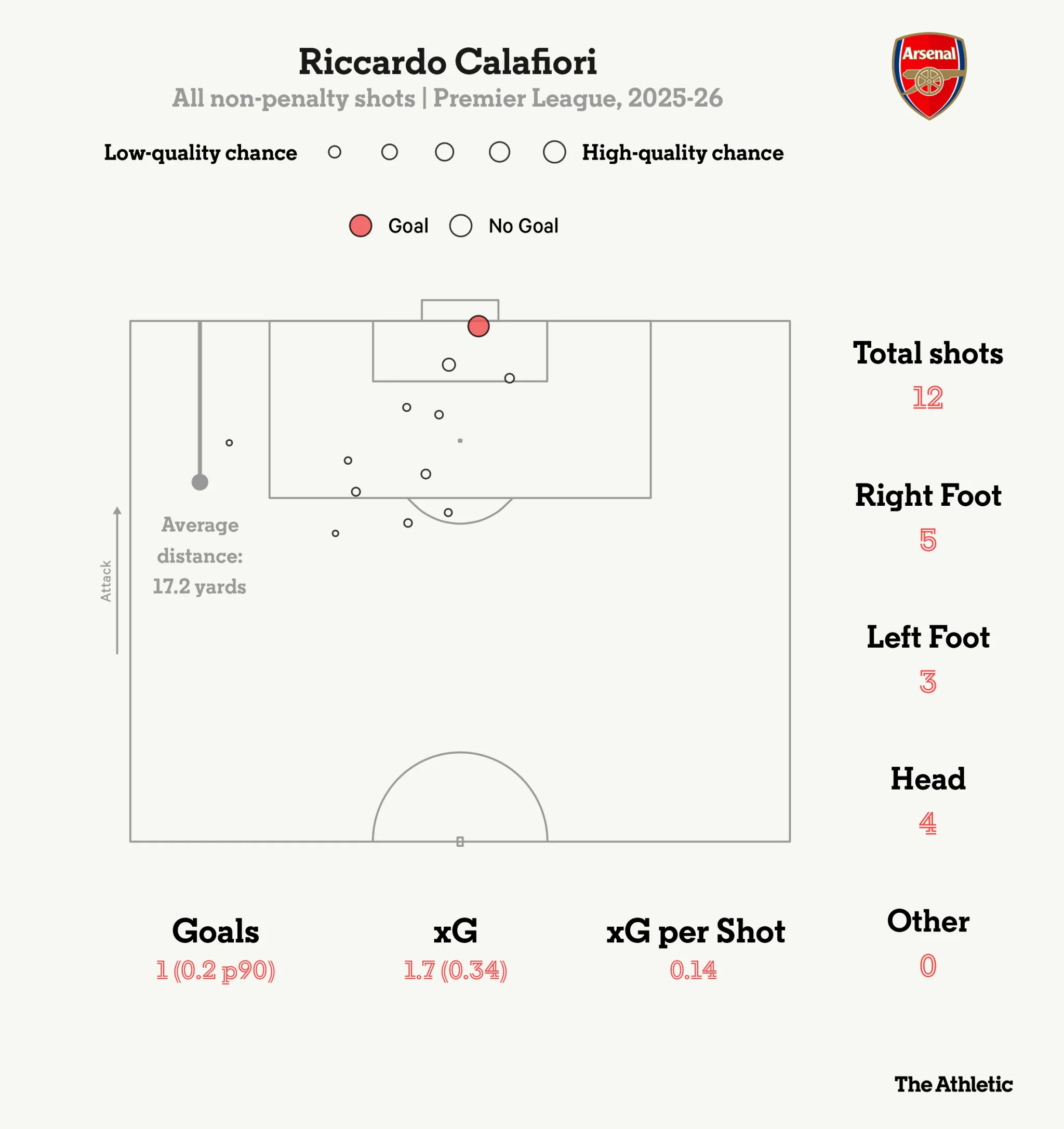 后衛(wèi)里卡多-卡拉菲奧里是阿森納隊內(nèi)射門最多的球員,新前鋒維克托-哲凱賴什則貢獻了12次射門(不包括點球)。