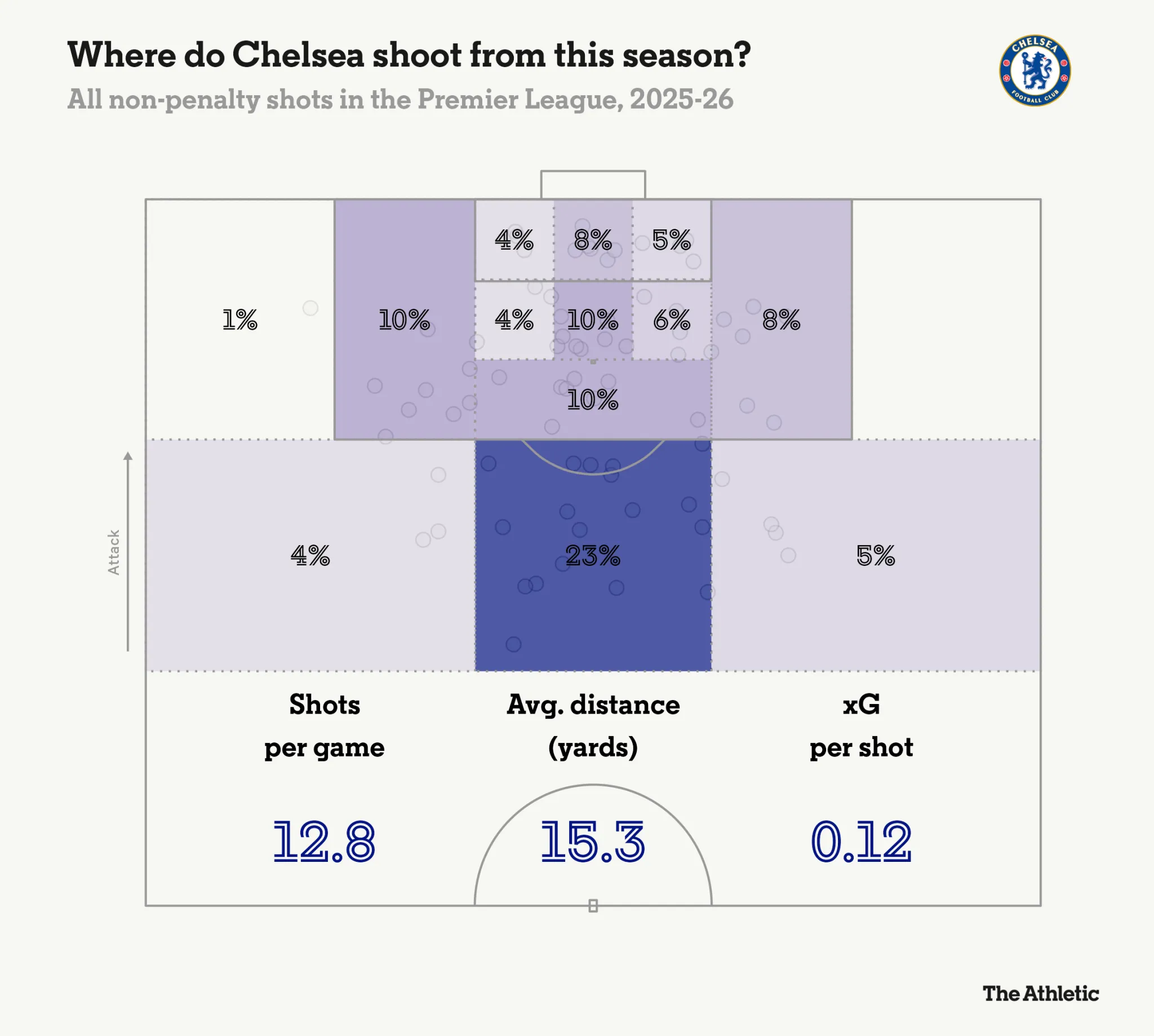 切爾西的進步之處在于他們的射門質(zhì)量,盡管他們在禁區(qū)外嘗試了相當多的射門,但他們的預期進球數(shù)(xGOT)達到了聯(lián)賽最高,達到14.1,如下圖所示。