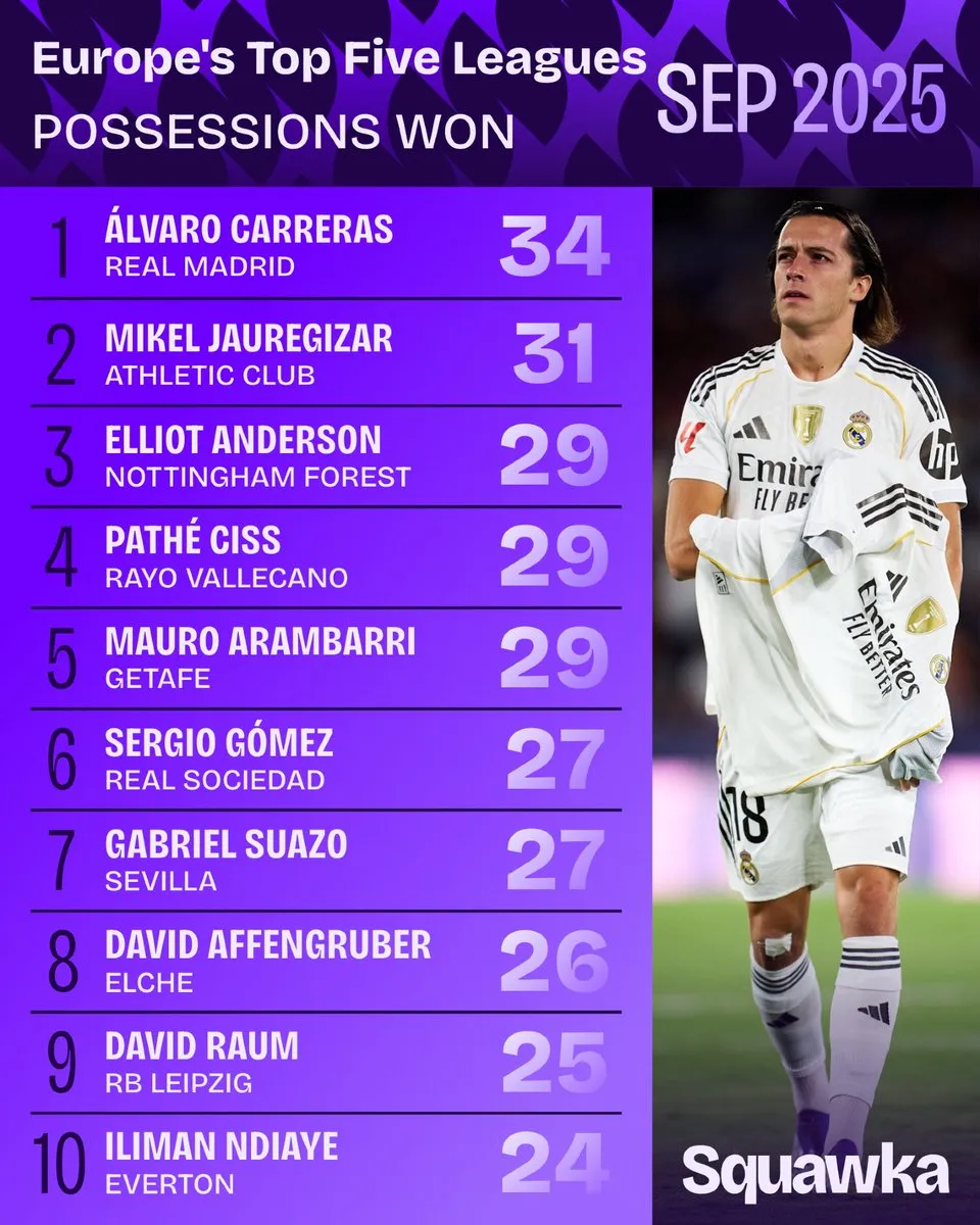 來源:X虎撲10月01日訊 據(jù)Squawka統(tǒng)計,9月份五大聯(lián)賽奪回球權次數(shù)的權次其次榜單排行如下: