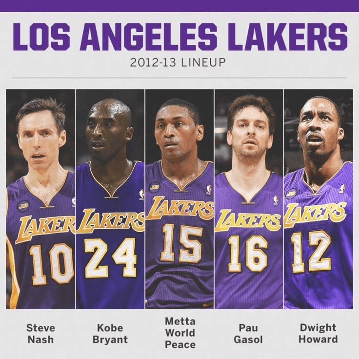 圖中的板媒五名球員是:史蒂夫-納什,科比-布萊恩特,顧年梅塔-沃爾德皮斯,湖人霍華保羅-加索爾和德懷特-霍華德。陣容
