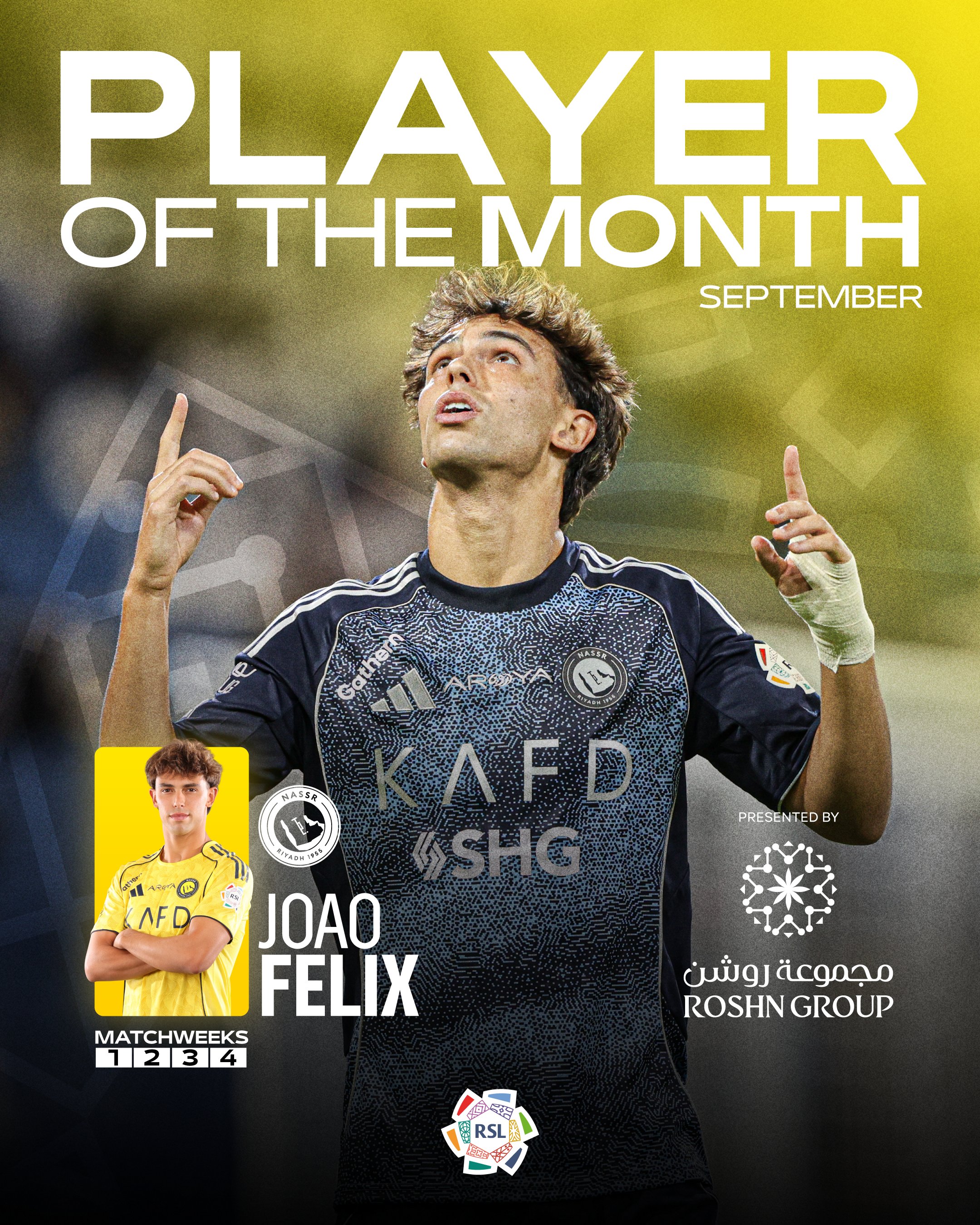 虎撲10月01日訊 沙特聯(lián)官方消息,菲利克斯當(dāng)選沙特聯(lián)9月份最佳球員。球助