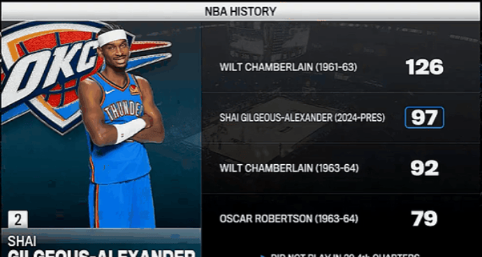 根據(jù)NBA官方數(shù)據(jù)統(tǒng)計:亞歷山大已連續(xù)97場比賽砍下20+得分,得分位列歷史第二位。板歷比賽