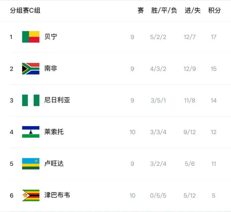 雖然同組對(duì)手實(shí)力不俗,但貝寧隊(duì)的發(fā)揮非常出色,目前以17分高居小組第一。如果最后一輪能客場(chǎng)拿下尼日利亞,他們將直通世界杯正賽。如果打平,則需要寄希望于南非不能凈勝盧旺達(dá)兩球。如果輸球,可能就需要進(jìn)行復(fù)雜的積分和凈勝球計(jì)算。