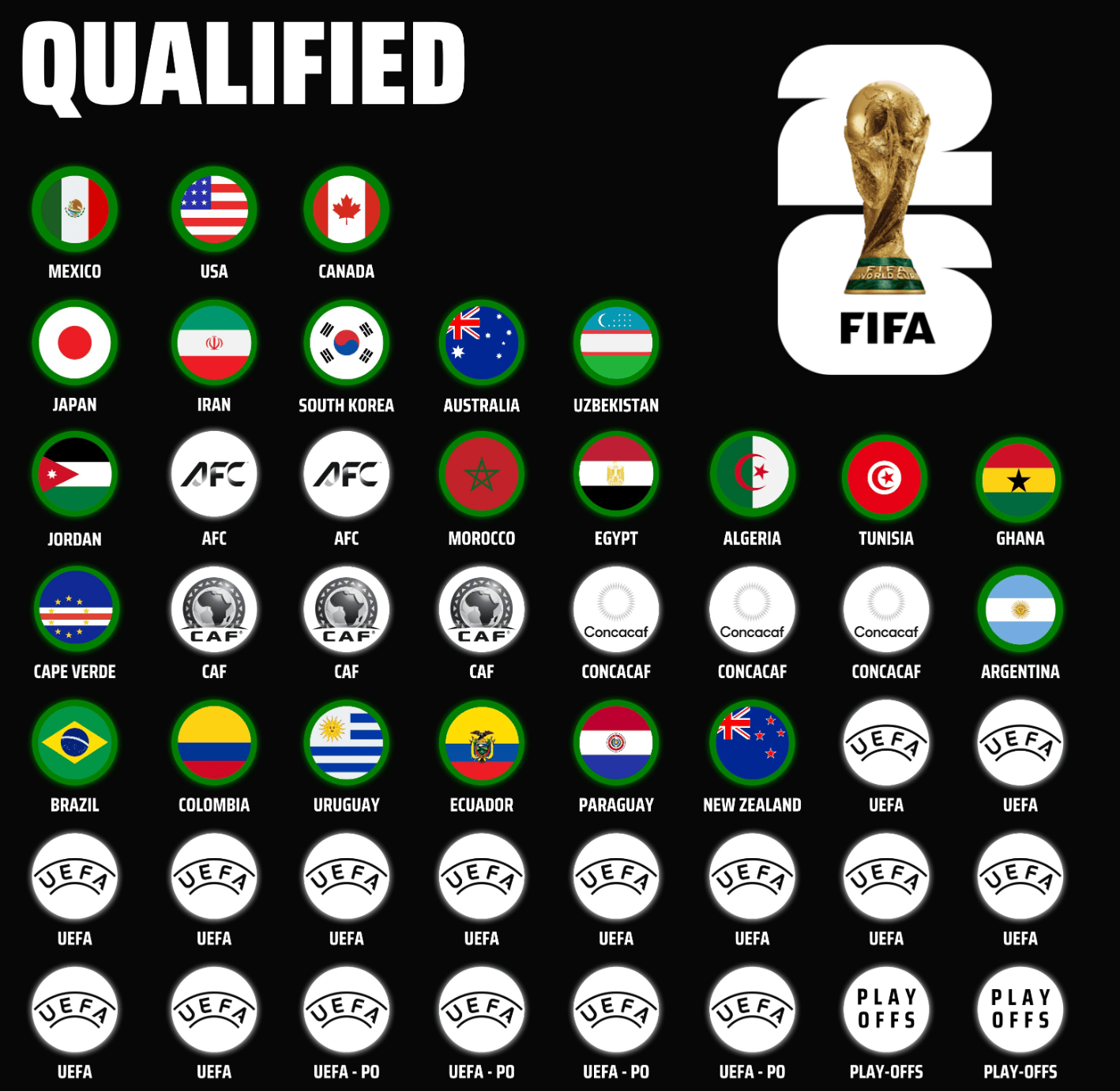 截至目前,已確認(rèn)晉級2026世界杯的球隊有22支:美國、墨西哥、加拿大、日本、新西蘭、伊朗、韓國、澳大利亞、烏茲別克斯坦、約旦、阿根廷、巴西、烏拉圭、厄瓜多爾、巴拉圭、哥倫比亞、摩洛哥、突尼斯、埃及、阿爾及利亞、加納和佛得角。