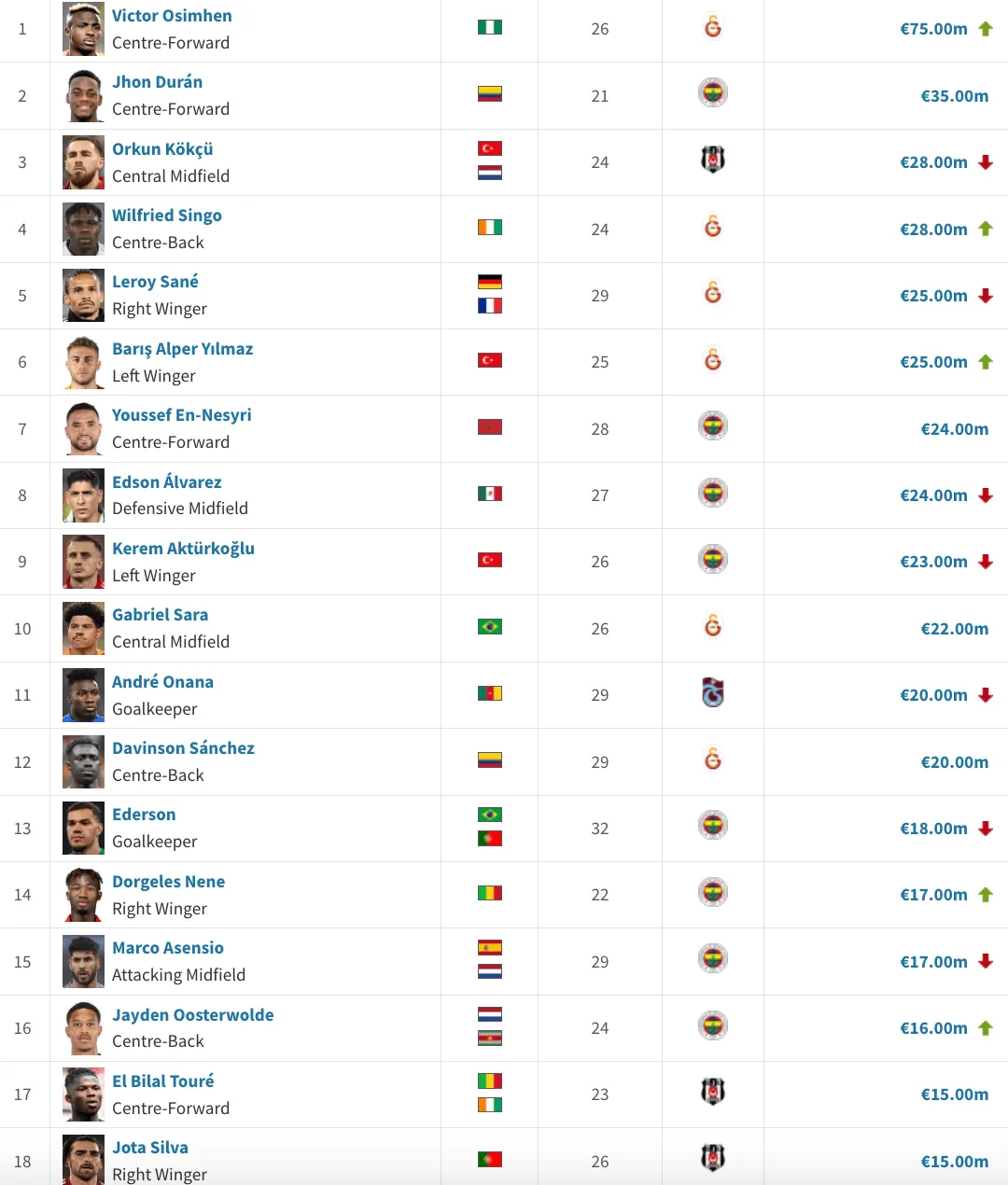 來源:transfermarkt虎撲10月01日訊 德轉(Transfermarkt)消息,土耳其超級聯(lián)賽共有285名球員的身價在夏季轉會窗后得到更新。剛剛以7500萬歐元從那不勒斯永久轉會至加拉塔薩雷的尼日利亞前鋒奧斯梅恩,繼續(xù)穩(wěn)居土超最有價值球員之首,并實現(xiàn)小幅上漲。