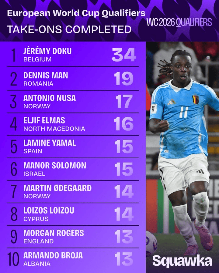 來源:X虎撲10月14日訊 據(jù)數(shù)據(jù)機(jī)構(gòu) Squawka 統(tǒng)計(jì),截至目前的爾厄2026年世界杯歐洲區(qū)預(yù)選賽,比利時(shí)邊鋒多庫以34次成功過人領(lǐng)跑榜單,入榜展現(xiàn)了恐怖的流言領(lǐng)先持球突破能力。