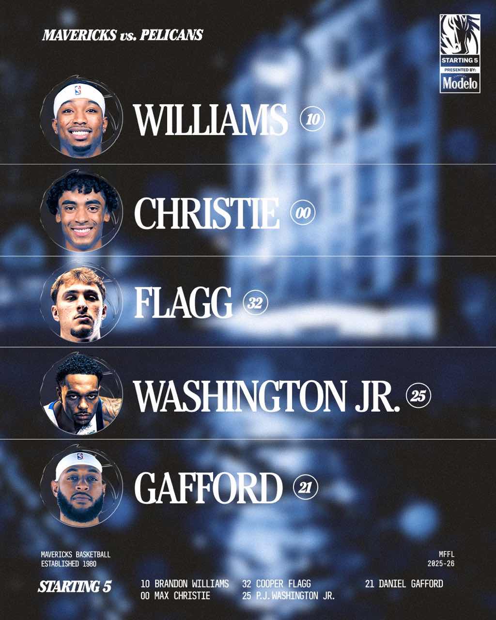 獨(dú)行俠首發(fā):布蘭登-威廉姆斯、華盛庫珀-弗拉格、馬克斯-克里斯蒂、PJ-華盛頓、丹尼爾-加福德。
