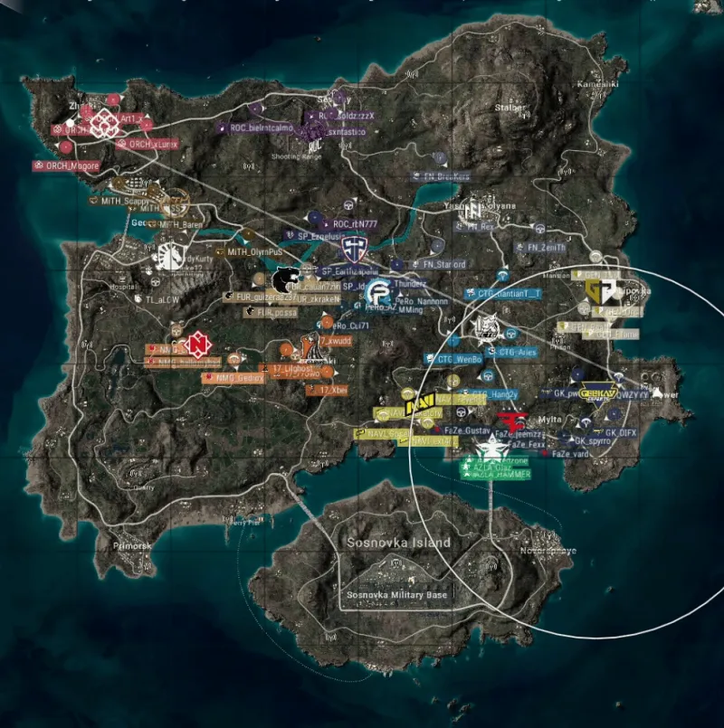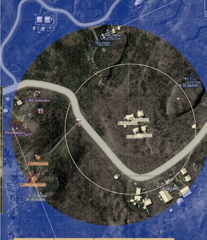 梅花樁,PeRo藍(lán)圈外被淘汰,F(xiàn)N被GEN炸倒三人后最后一人藍(lán)圈外淘汰,GEN天命房區(qū)吃雞。