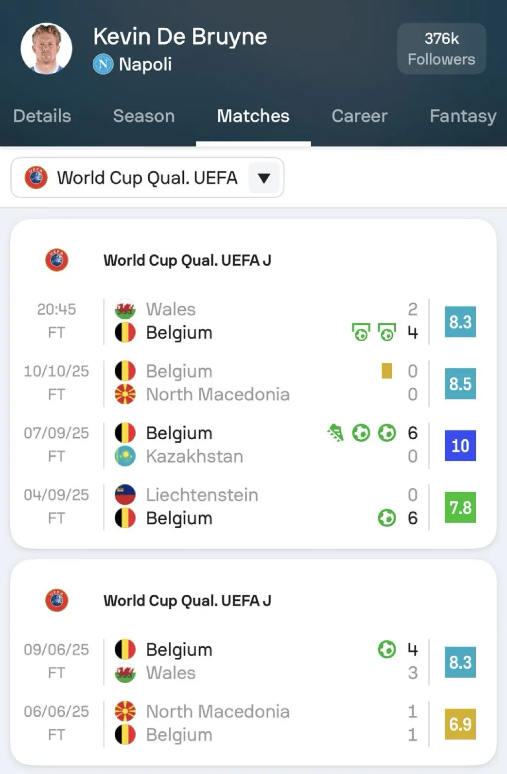 虎撲10月14日訊 根據(jù)Sofascore的統(tǒng)計,德布勞內是內本2026年世界杯歐洲區(qū)預選賽表現(xiàn)最好的中場球員之一: