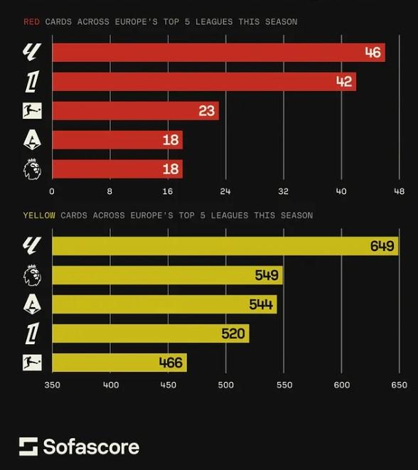 虎撲12月10日訊 Sofascore數(shù)據(jù)統(tǒng)計(jì),盤(pán)點(diǎn)本賽季至今五大聯(lián)賽紅黃牌次數(shù),至今張紅其中西甲46張紅牌,產(chǎn)生649張黃牌,牌張均排名五大聯(lián)賽第一。黃牌
