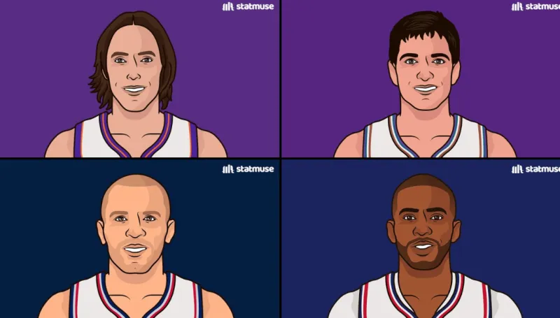 圖中的四名球員是:史蒂夫-納什,約翰-斯托克頓,杰森-基德和克里斯-保羅。