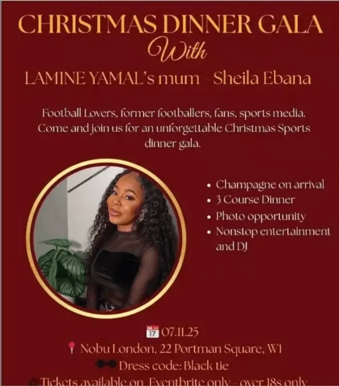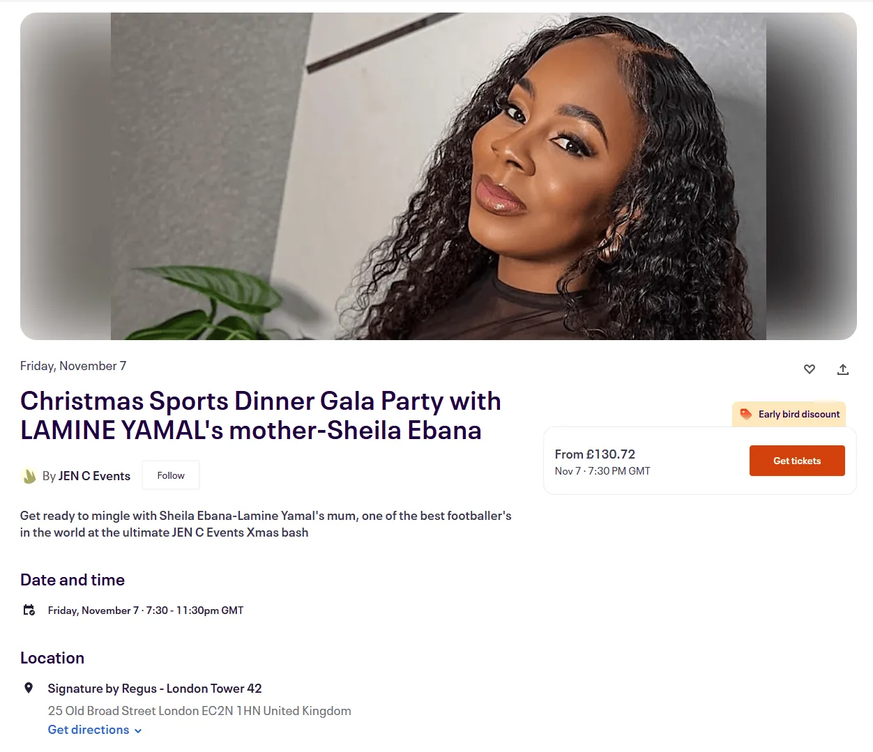 來源:Instagram虎撲10月02日訊 知名婚禮和活動策劃公司JEN C Events宣布,亞馬爾的母親Sheila Ebana將出席11月7日在倫敦舉行的一場圣誕晚宴,而想要參加這場晚宴則要付最少130.72鎊的門票價格。