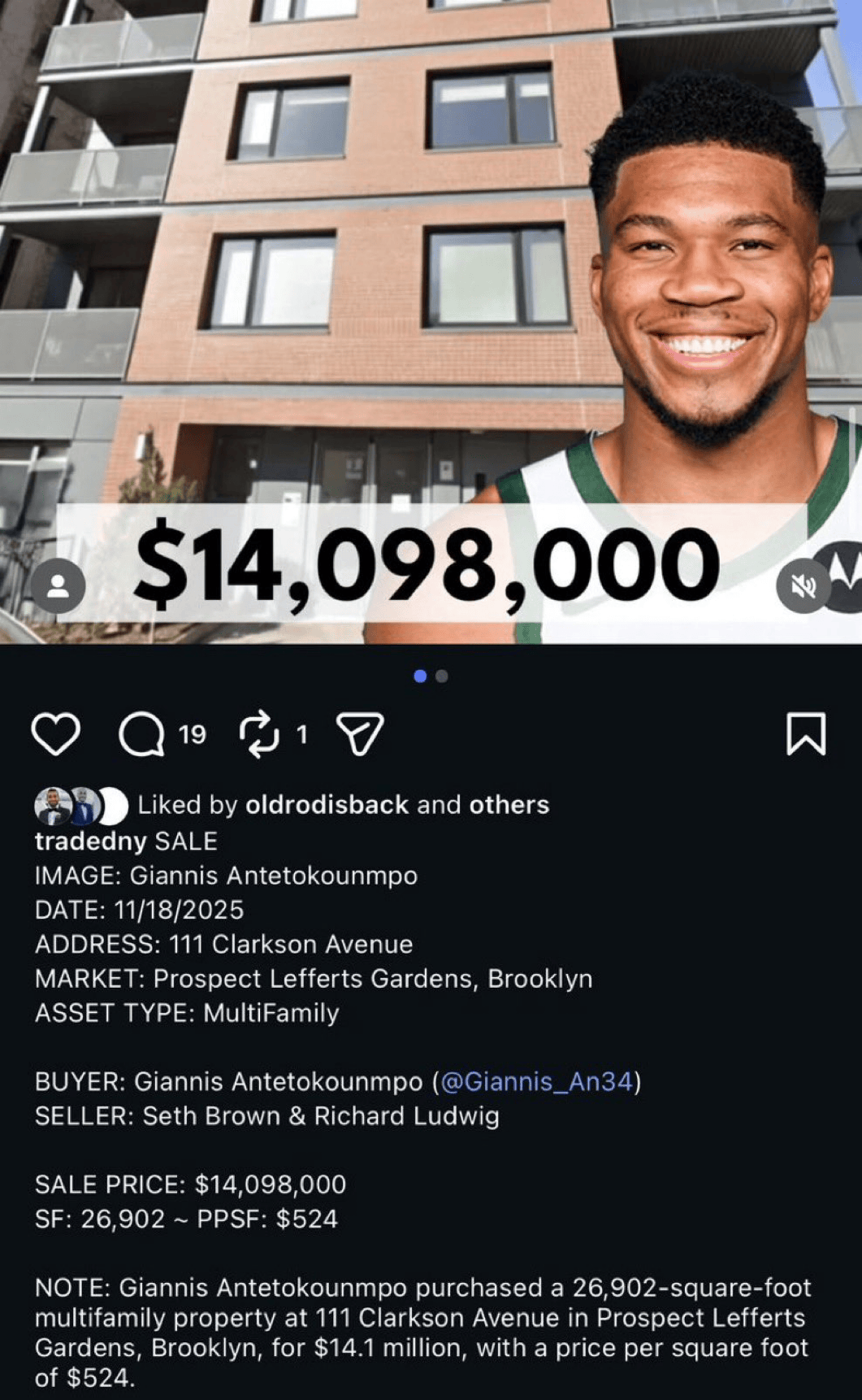 “揚(yáng)尼斯-阿德托昆博已在紐約購置了一處房產(chǎn)”,揚(yáng)尼Hoops附文道。揚(yáng)尼