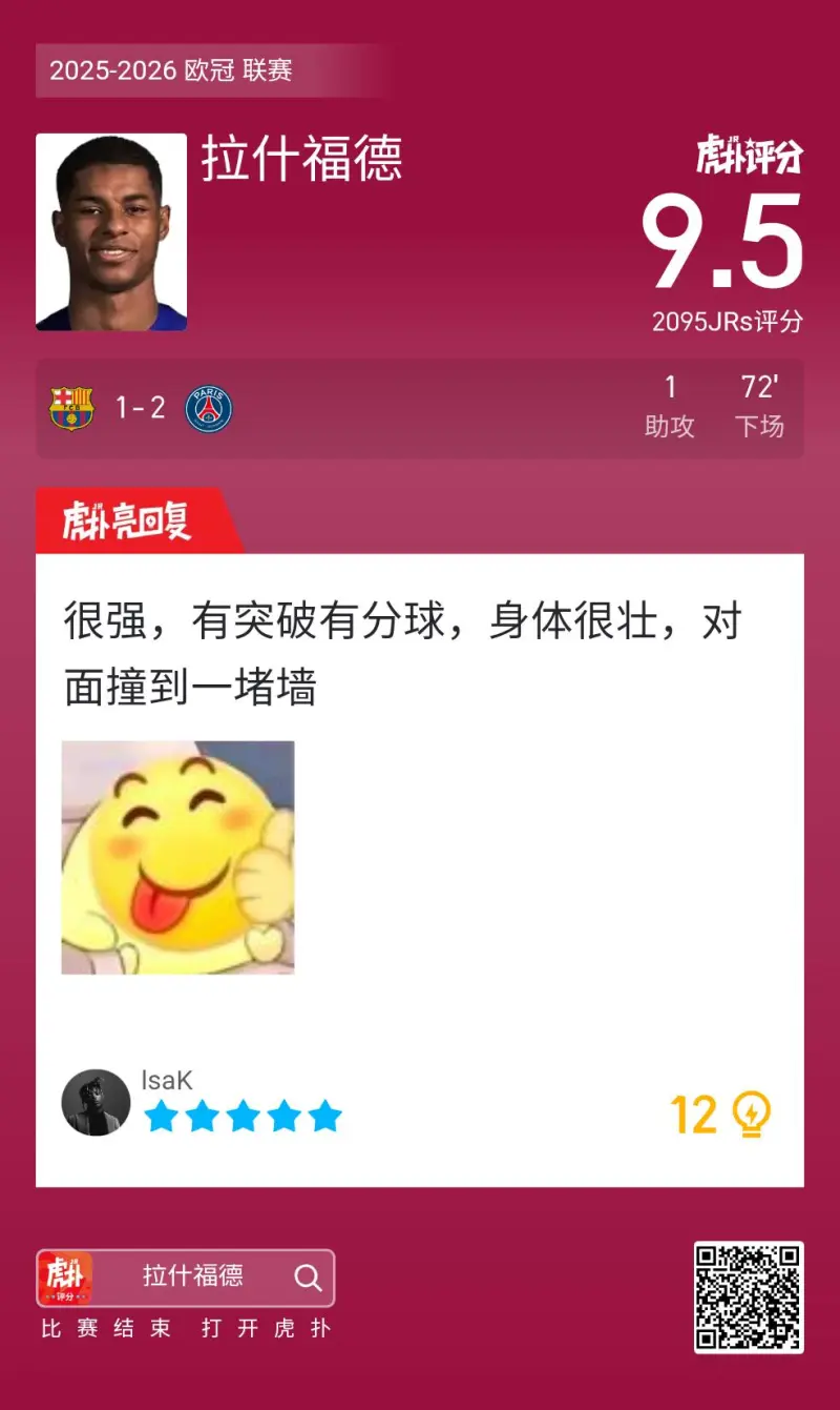 巴薩1-2巴黎,拉什福德助攻全隊唯一進球