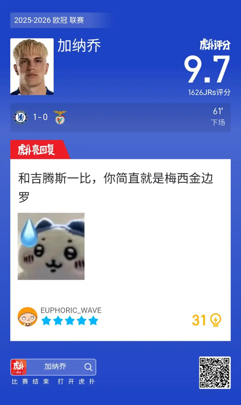 切爾西1-0本菲卡,造烏助攻加納喬造對手烏龍,師傅助球隊取勝