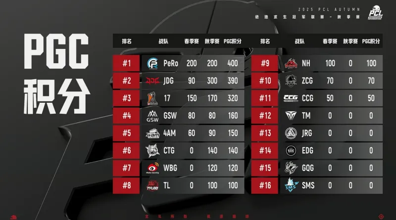 來源:虎撲虎撲09月28日訊 2025PCL賽事已全部結(jié)束,兩屆賽事結(jié)束后,代表PCL出征年底PGC的名額已定五席。