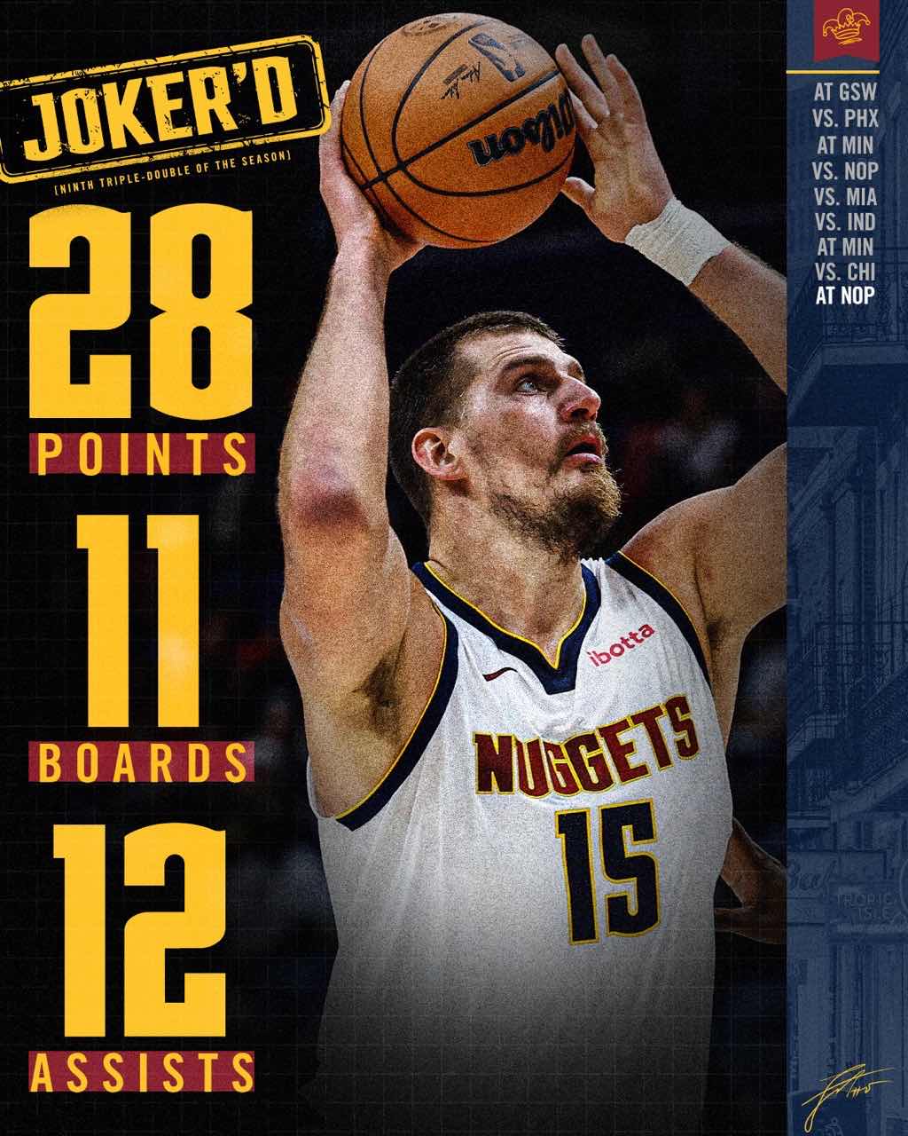 賽后,掘金社媒分享約基奇本場海報:收獲本賽季第9次三雙。