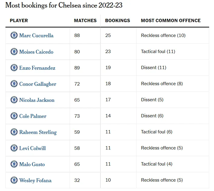 不可避免地,切爾西拿黃牌的大多數(shù)球員都是防守型球員,但科爾-帕爾默、恩佐-費(fèi)爾南德斯和杰克遜在所有類別中因異議吃到最多黃牌的事實(shí),凸顯了球隊(duì)的一些不成熟。