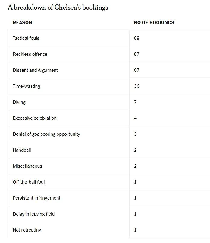 在這兩位教練的帶領(lǐng)下,切爾西因“戰(zhàn)術(shù)犯規(guī)”受到的處罰最多。這種情況通常發(fā)生在你試圖阻止反擊、阻止球員進(jìn)入或創(chuàng)造進(jìn)球機(jī)會(huì),或非法阻止對(duì)手以確保比賽暫停,讓隊(duì)友重新回到防守狀態(tài)時(shí)。
