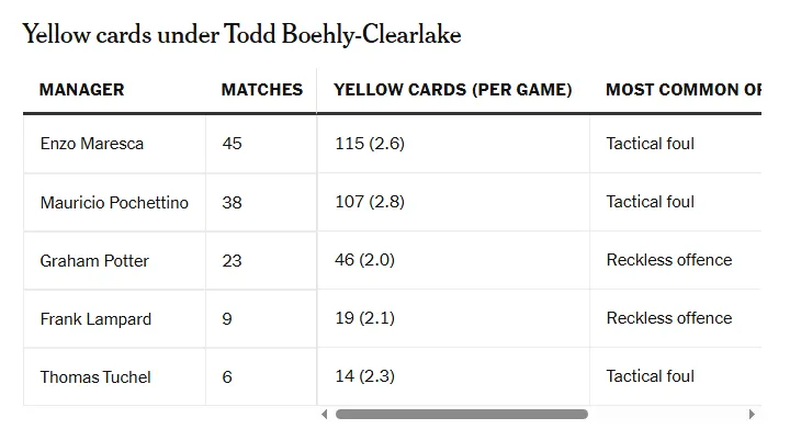 2022-23賽季,切爾西在公平競(jìng)賽積分榜上排名第六(86分)。接下來(lái)的賽季,他們的積分上升到最高(117分),并創(chuàng)造了105張黃牌的英超新紀(jì)錄。