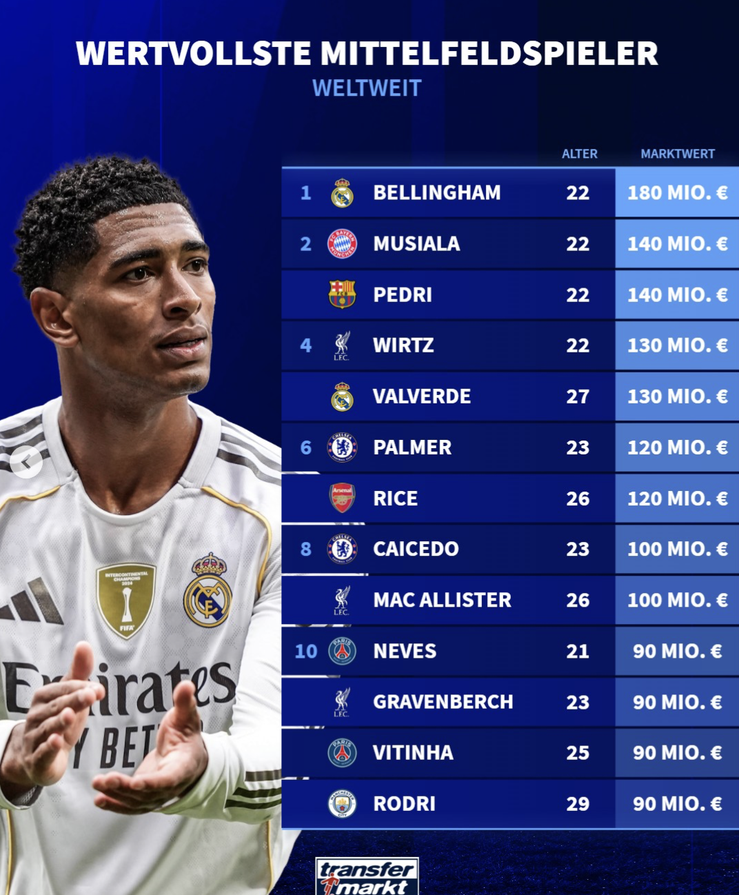 皇馬的員身貝林厄姆以1.8億歐居首,穆夏拉和佩德里以1.4億歐并列第二。價榜
