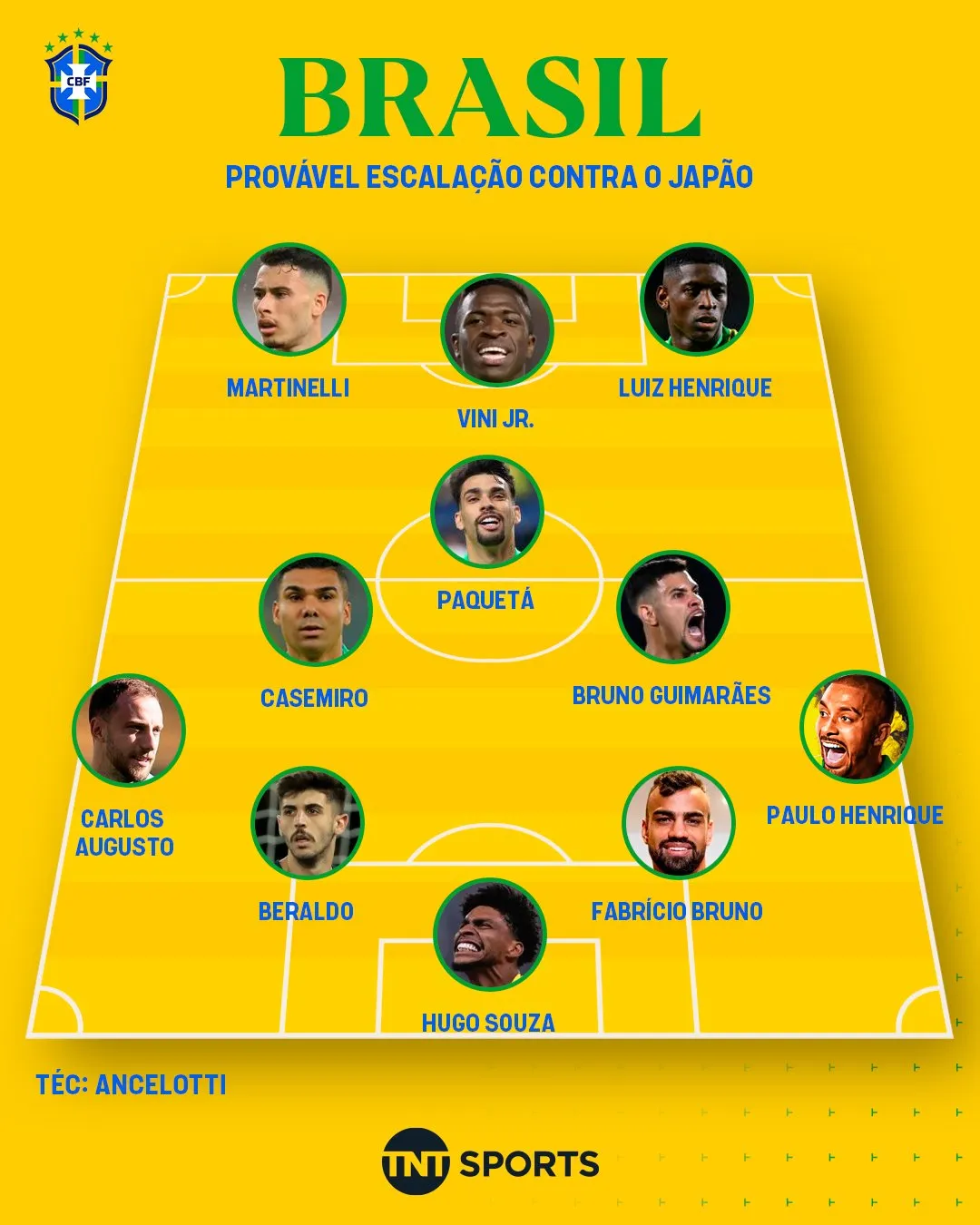 對陣日本的比賽陣型預計將和5-0大勝韓國的不同,球隊的陣型也從4-2-4調(diào)整為4-3-3,其中布魯諾-吉馬良斯的位置將更靠前,與帕奎塔搭檔,而維尼修斯則會更靠近中路,幾乎扮演中鋒角色。