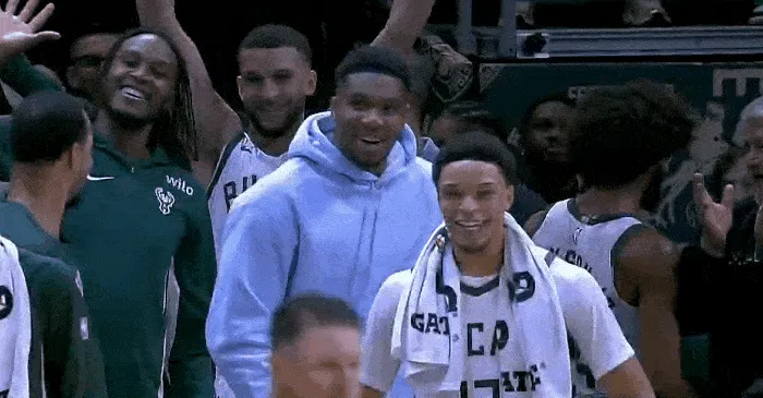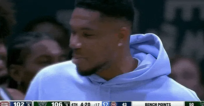第四節(jié)比賽中,歡呼字母哥哥薩納西斯單手空接暴扣,流言鹿替雄鹿替補(bǔ)席全體起立歡呼慶祝。板過補(bǔ)席