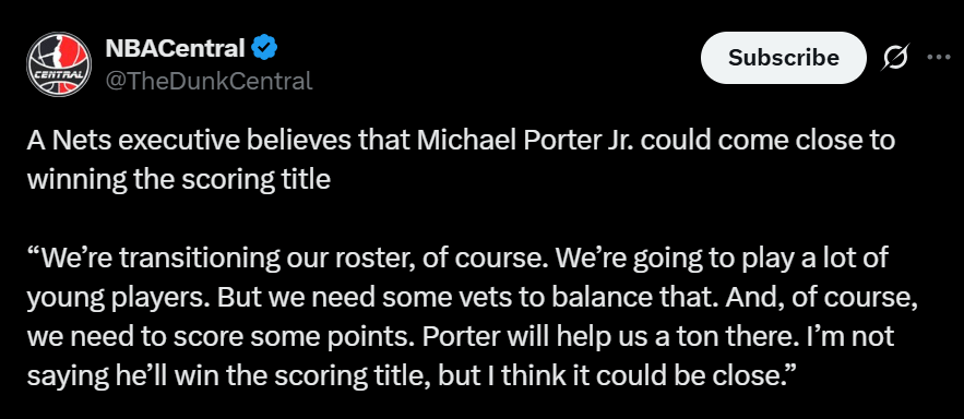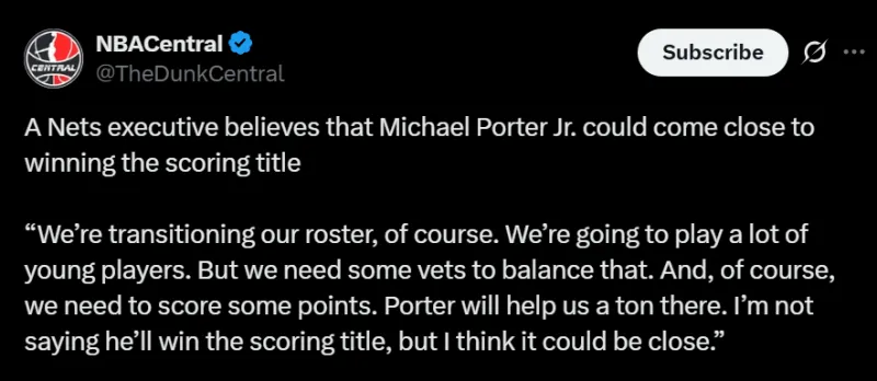 虎撲07月25日訊 今日,知名美媒The網(wǎng)高NBACentral轉發(fā)了一則籃網(wǎng)高管對新援小邁克爾-波特的評價: