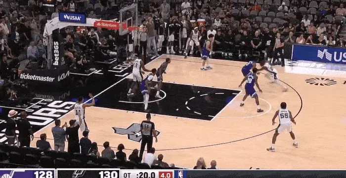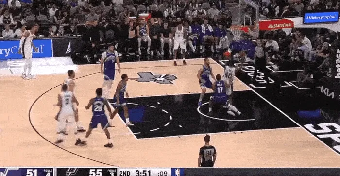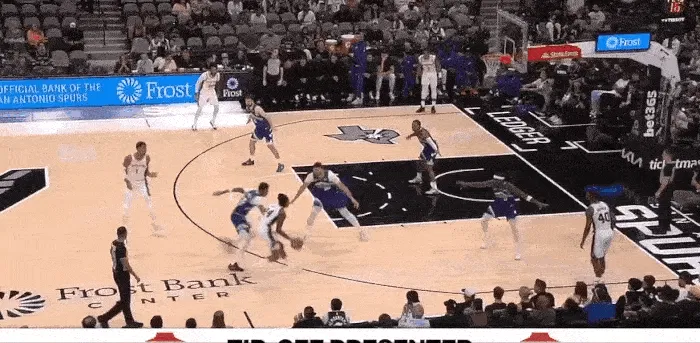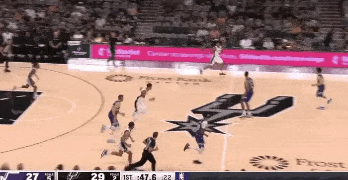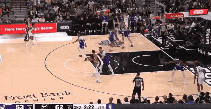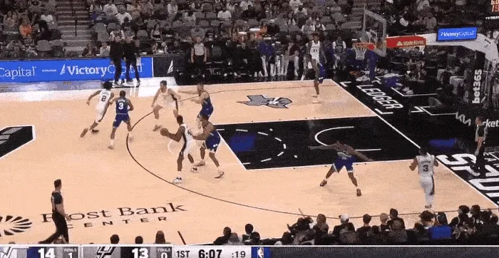 第一節(jié)比賽最后一分鐘,馬刺隊籃板球快攻,哈珀持球,三分線外減速,觀察,等文班進入三分線,一記傳球引導(dǎo)著文班完成了空接。