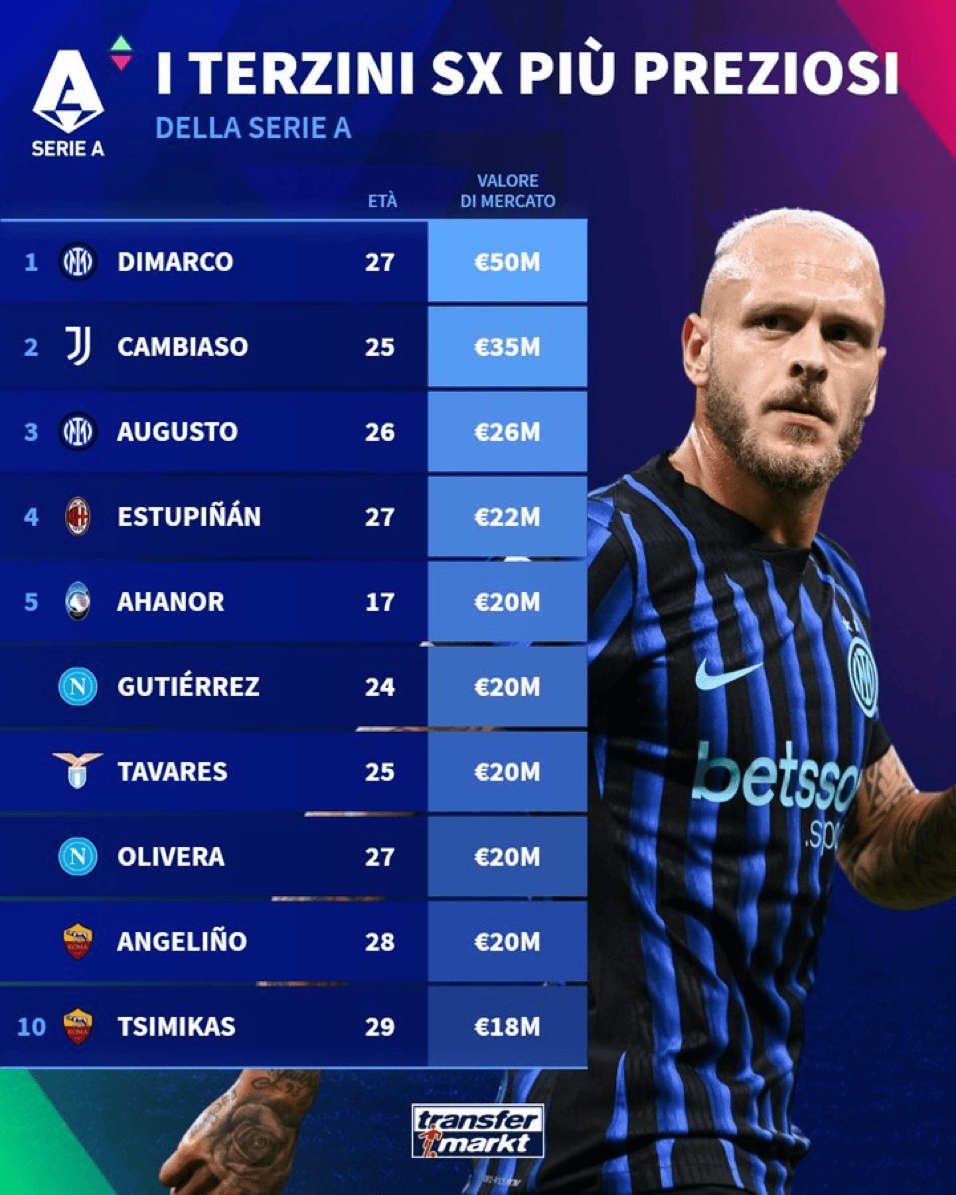 來源:X虎撲10月13日訊 德國轉(zhuǎn)會市場統(tǒng)計了效力于意甲聯(lián)賽的左后衛(wèi)球員身價,并進(jìn)行了排行: