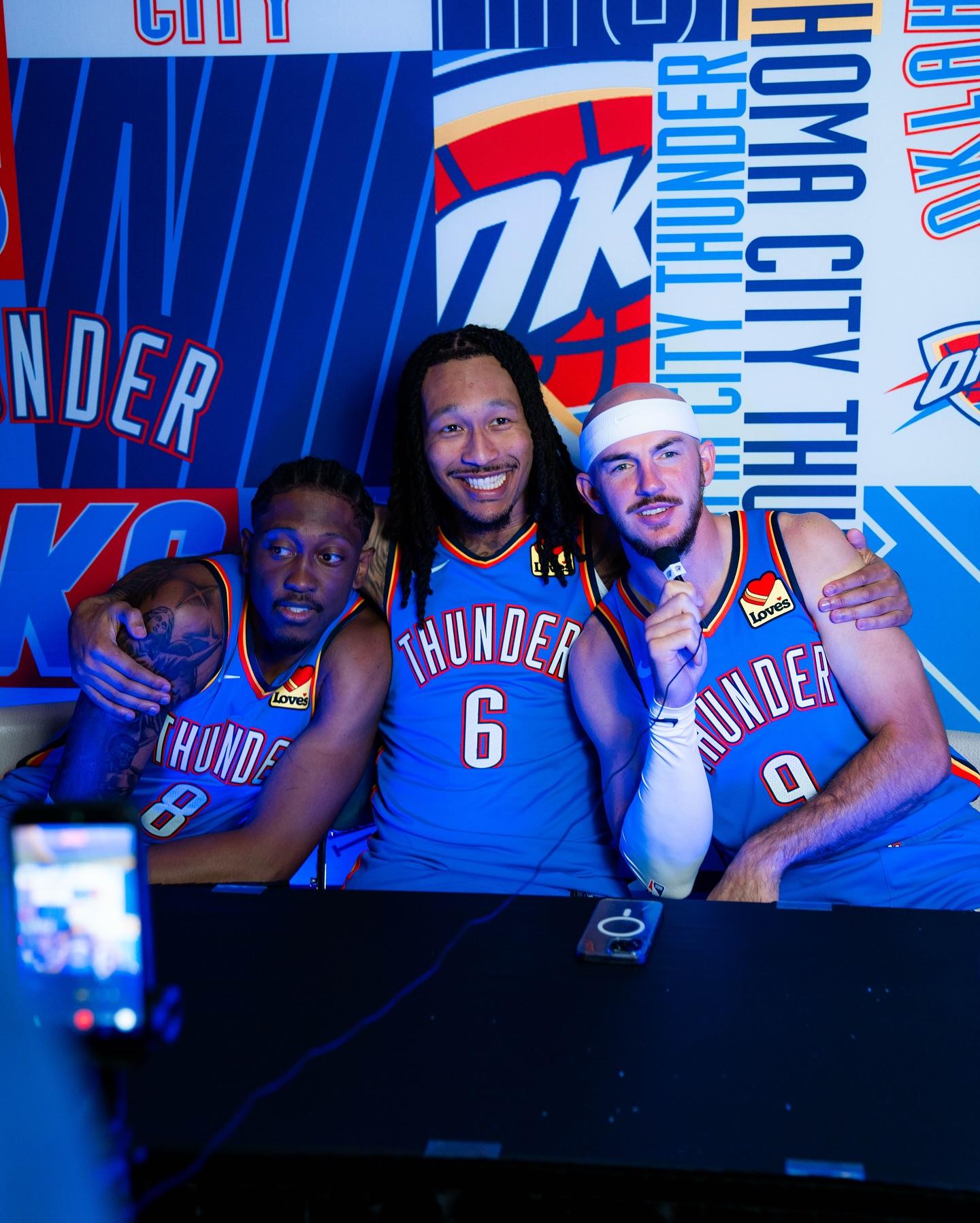 虎撲10月01日訊 今日,雷霆社媒曬出杰倫-威廉姆斯、卡魯杰林-威廉姆斯、合影亞歷克斯-卡魯索三人的照片合影照片,并配文: