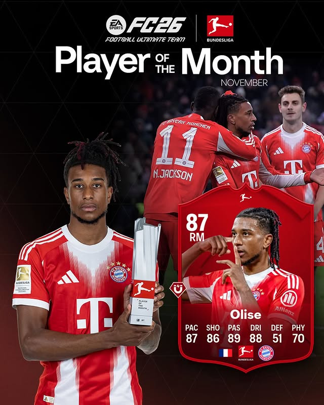 11月份奧利塞代表拜仁出戰(zhàn)4場(chǎng)德甲,奧利打入2球并送出3次助攻。塞當(dāng)