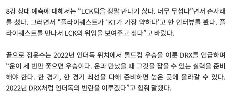 最后,Peter選手表示,“只要運氣好三次就是冠軍,運氣來臨時必須要準備好抓住運氣的實力。只要竭盡全力準備好每一場比賽,我們就能走到高處。我們會像22DRX一樣實現(xiàn)黑馬的叛亂。“