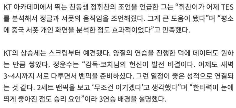 Peter選手談到了效力于KT青訓的自己親弟弟的建議,“弟弟昨天分析了TES,給了我關于野輔聯(lián)動的建議。這有很大的幫助。我平時會分析中國打野們的個人視角,這也有效果。”